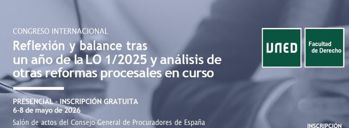 La Escuela de Práctica Jurídica de la Facultad de Derecho de la Universidad Nacional de Educación a Distancia (UNED), en colaboración con el Consejo General de Procuradores de España, el Centro de Estudios Garrigues, las Facultades de Derecho de las Universidades de Girona y Almería, y la Red Iberoamericana de InvestigaciónI Interuniversitaria para el Diálogo Jurídico entre Europa y América, convoca para los días 6 al 8 de mayo la celebración de un Congreso Internacional, en la sede del Consejo Gral. de Procuradores de España: "Reflexión y balance tras un año de LO 1/2025 y análisis de otras reformas procesales en curso".