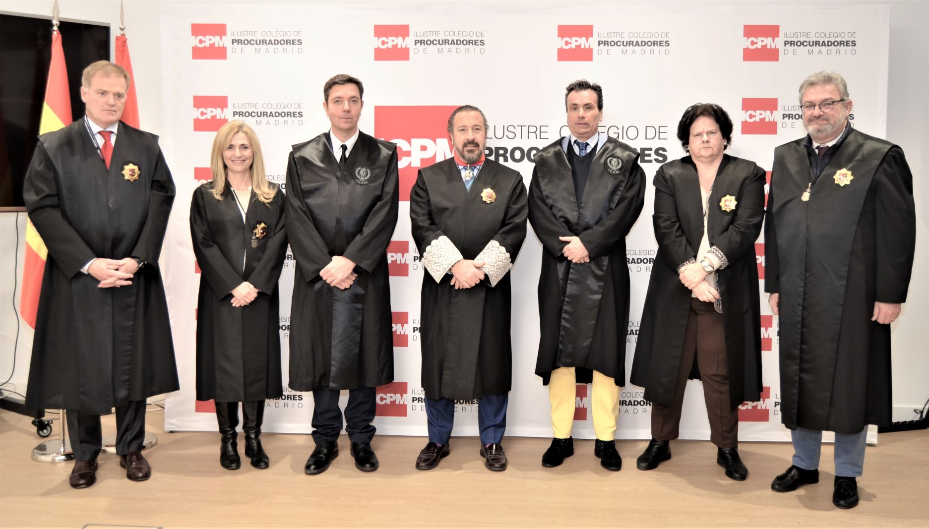 En la imagen, los participantes en la sesión y M.ª del Carmen Giménez Cardona con las compañeras procuradoras M.ª Cruz Ortiz, Gloria Leal (vicepresidenta de la Comisión de Igualdad del ICPM), Virginia Gutiérrez y Marta Barreda.