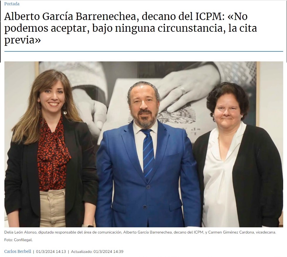 (De izda. a dcha. Delia León Alonso, vocal responsable del área de comunicación; Alberto N. García Barrenechea, decano del ICPM; y M.ª del Carmen Giménez Cardona, vicedecana. Foto: Confilegal)