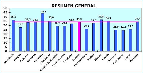 - La mayor litigiosidad, en Canarias, Madrid y Andalucía: La tasa de litigiosidad en el conjunto del Estado fue de 33,9 asuntos por cada 1.000 habitantes. Las comunidades que mostraron una media superior a la nacional fueron Canarias (44,1), Madrid (36,8), Andalucía (36,5), Cantabria (35), Murcia (34,9) y Comunidad Valenciana (34,4).