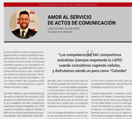 La Revista ICPM incluye en su último número un artículo del compañero procurador José Antonio Julián Ortín, sobre su experiencia en el Servicio de Actos de Comunicación.