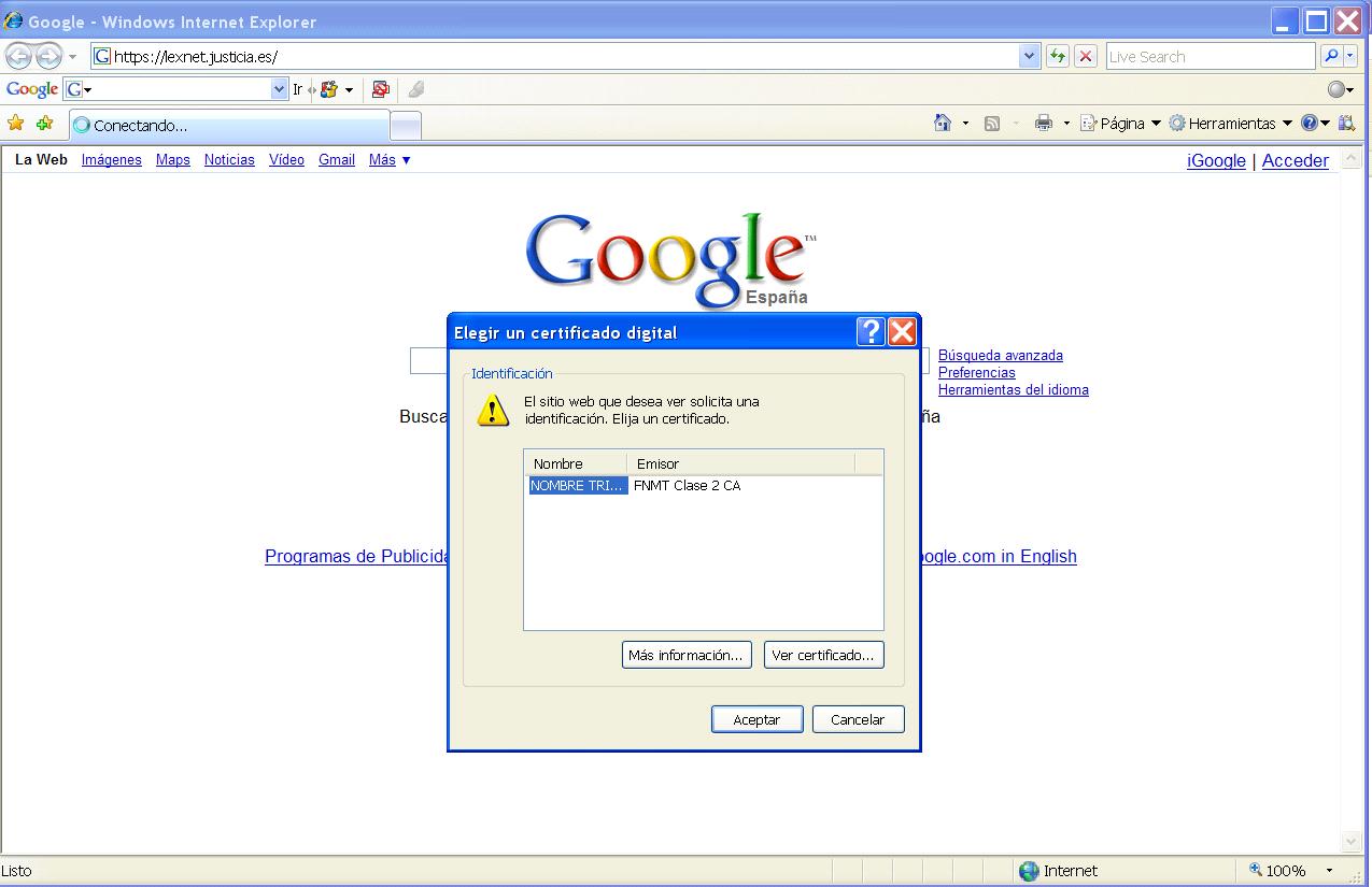 Escribimos la url "https://lexnet.justicia.es" en el navegador y nos aparecerá una pantalla solicitándonos un certificado tal como esta: