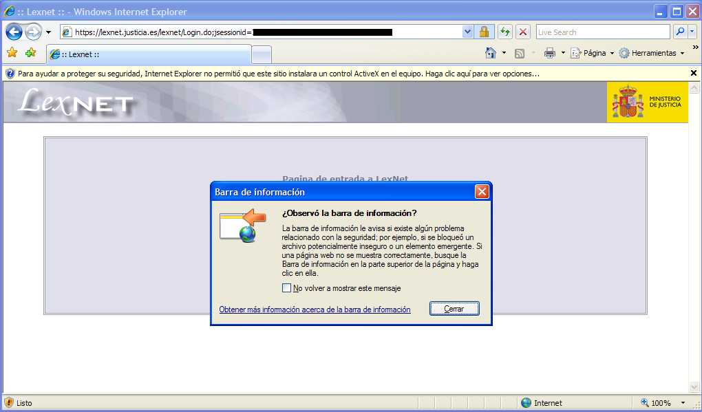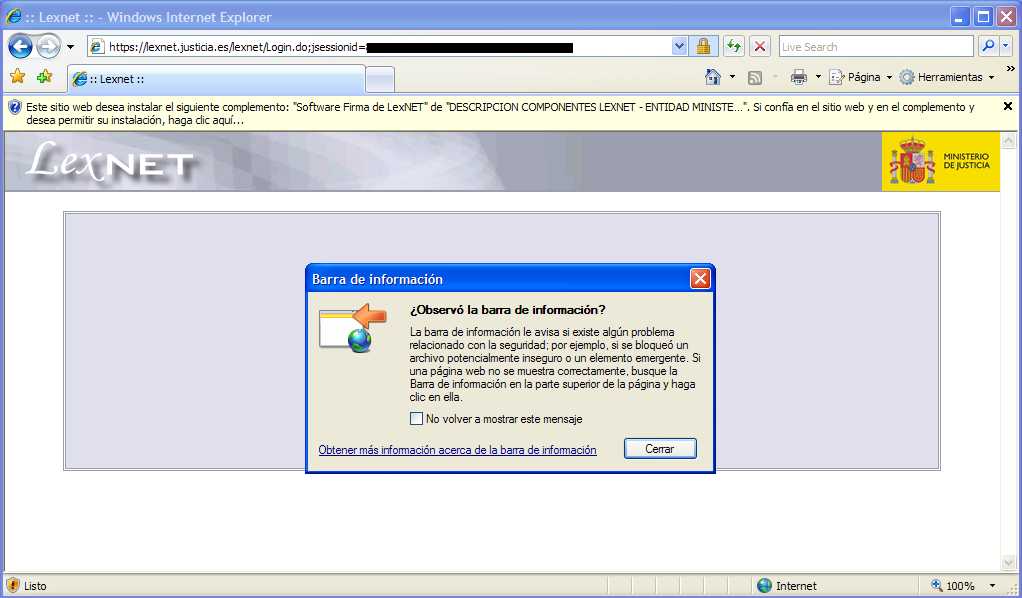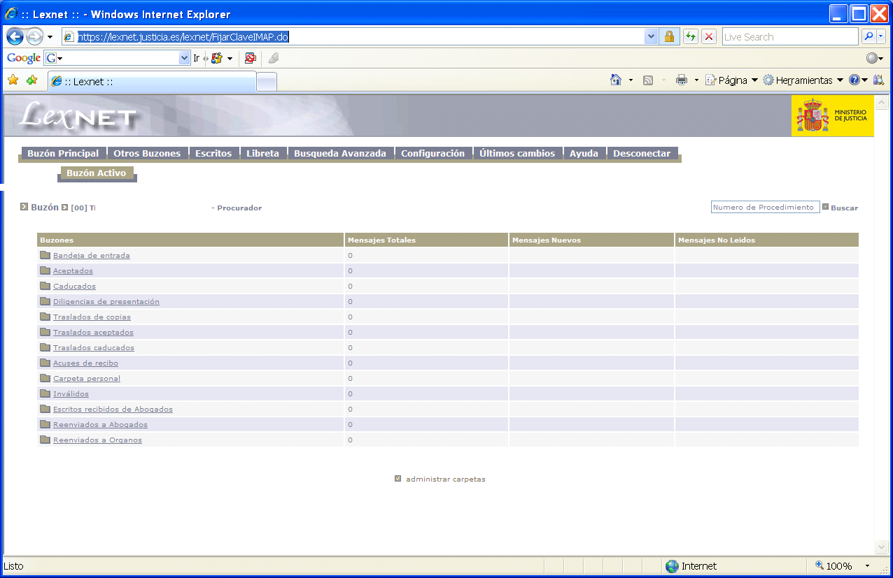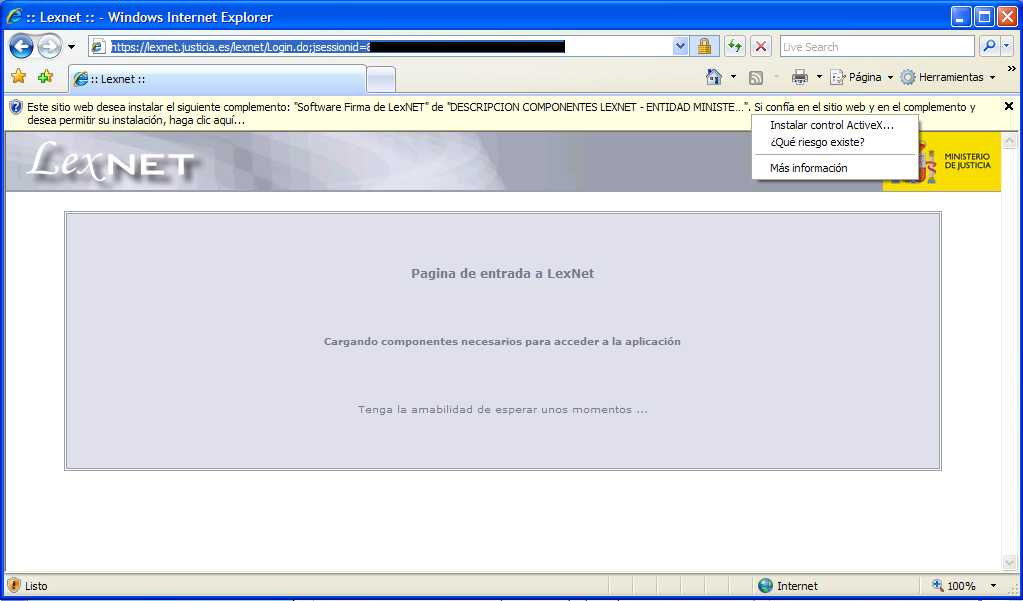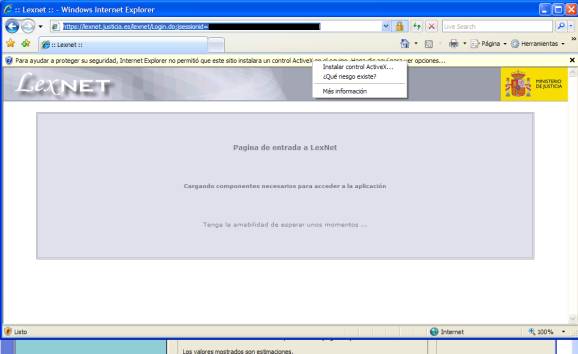 Tras la instalación del control ActiveX veremos como se carga la página de Lexnet y finalmente entraremos en nuestro buzón......