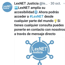 Ampliación de acceso a LexNET desde el extranjero 05/12/2018 Recordamos que con fecha del pasado 30 de octubre a través del perfil oficial de LexNET en la red social Twitter @lexnetjusticia, se informaba de la ampliación de accesibilidad desde cualquier parte del mundo.