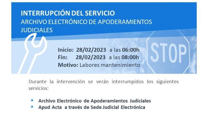 Recibimos información sobre la próxima interrupción del Servicio de Archivo Electrónico de Apoderamientos Judiciales, con motivo de realizarse labores de mantenimiento, el día 28 de febrero, desde las 06:00 y hasta las 08:00 h.