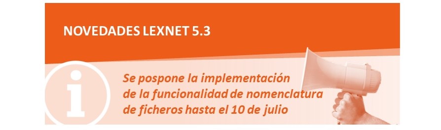 Como continuación a la habilitación desde el pasado 22 de junio de la versión 5.3 de LexNet, que según información recibida incorpora mejoras en términos de rendimiento y nuevas funcionalidades solicitadas por diversos colectivos, el Ministerio de Justicia ha decidido posponer la implementación de la funcionalidad de nomenclatura hasta el 10 DE JULIO, con el objetivo de representar adecuadamente los intereses de todos los grupos y maximizar los beneficios de la transformación digital en el servicio público de justicia. El resto de las mejoras seguirán disponibles.