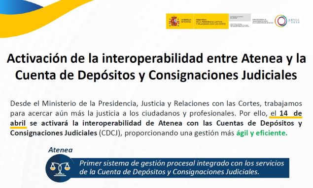 El Ministerio de la Presidencia, Justicia y Relaciones con las Cortes activará la interoperabilidad de Atenea con las Cuentas de Depósitos y Consignaciones Judiciales el próximo día 14 de abril.