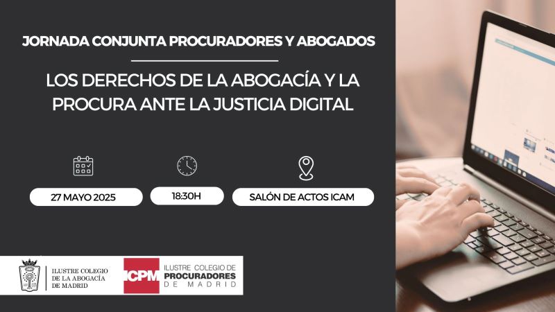 - 18:40 h JUSTICIA DIGITAL DESDE EL PUNTO DE VISTA DE LA ABOGACÍA Y LA PROCURA. Ponentes: M.ª del Carmen Giménez, vicedecana del ICPM; Javier Mata, diputado del ICAM; Antonio Sánchez-Jáuregui, vocal de la Junta de Gobierno del ICPM y presidente de la Comisión de Justicia Gratuita y Turno de Oficio; y Juan Manuel Mayllo, diputado de la Junta de Gobierno del ICAM responsable de Turno de Oficio.