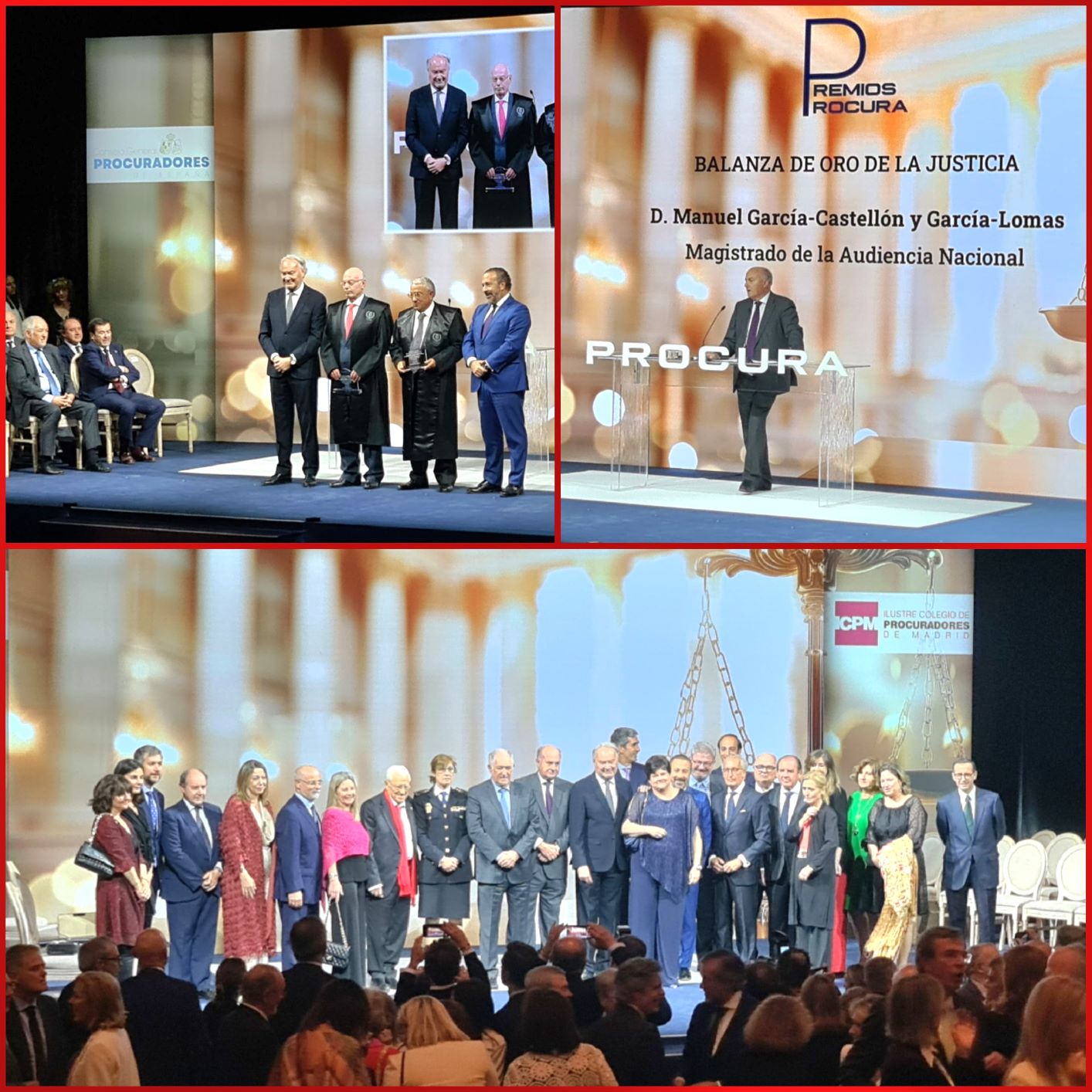 El acto continuó con la entrega de los Premios Procura, la distinción "Balanza de Oro del ICPM" al magistrado de la Audiencia Nacional Manuel García-Castellón "por su dilatada trayectoria profesional como magistrado en los distintos destinos que ha ocupado, así como por su contante contribución a la defensa del Estado de Derecho y La Constitución, como marco fundamental de los derechos y libertades de los ciudadanos". García-Castellón, que recibió el premio de manos del presidente del CGPJ Vicente Guilarte, agradeció este reconocimiento a su labor y recordó al magistrado Ramón Rodríguez Arribas, recientemente fallecido, y a su hijo el procurador Ramón Rodríguez Nogueira, y alertó en su discurso sobre los peligros de los ataques "ad hominen" personales a los jueces: "es como el humo que anuncia fuego", señaló. Además, alentó a impedir la arbitrariedad y la influencia de otros poderes en la instrucción de las causas penales.