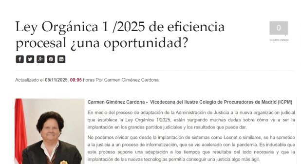 Facilitamos enlace al artículo de Opinión publicado en el diario legal digital Law&Trends con la firma de la vicedecana del ICPM, M.ª del Carmen Giménez Cardona:
