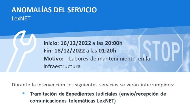 Recordamos la notificación de LexNet en relación con la parada prevista para este próximo VIERNES 16 de diciembre, desde las 20:00 hasta la 01:20 del domingo 18, por motivos de mejora del servicio.