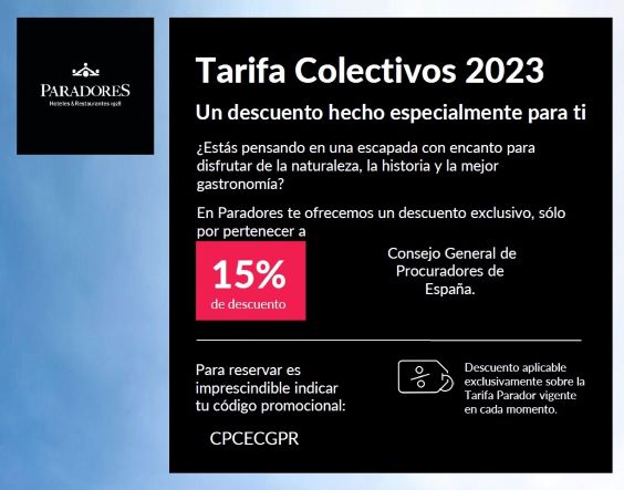 Por si fuera de interés, damos traslado de información relativa al acuerdo de colaboración firmado por el Consejo General de Procuradores y Paradores de Turismo de España, a través del cual se ofrece unas condiciones especiales para los colegiados en 2023.