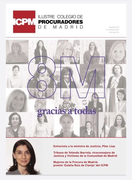 Presentamos un nuevo número de nuestra Revista ICPM, con noticias, contenidos y colaboraciones de interés profesional recogidos durante el primer trimestre del año y, en esta ocasión, dedicada especialmente a la entrega del Premio "Eulalia Ruiz de Clavijo" del ICPM a las Mujeres de la Procura de Madrid, con motivo de la celebración del Día Internacional de la Mujer. Recordamos también el vídeo institucional que hemos realizado gracias a la colaboración de la ministra de Justicia, Pilar Llop; del presidente del Tribunal Superior de Justicia, Celso Rodríguez; y del consejero de Presidencia, Justicia e Interior de la Comunidad de Madrid, Enrique López, disponible en nuestra cuenta oficial de YouTube: www.youtube.com/c/IcpmEsOficial