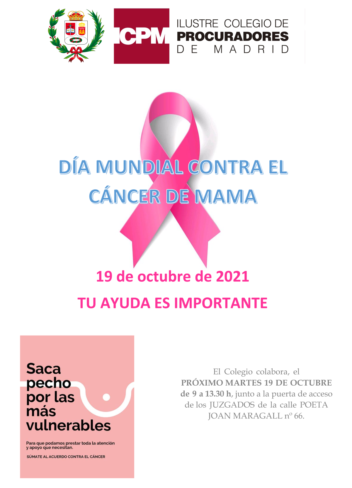 Con motivo del Día Mundial Contra el Cáncer de Mama que tiene lugar cada año el 19 de octubre, desde el ICPM queremos unirnos a la campaña de difusión para la prevención y apoyo a las mujeres con una mesa informativa y de recogida de donativos, MAÑANA MARTES 19 de octubre de 9 a 13.30 h, que estará situada junto a puerta de acceso de los Juzgados de la calle poeta Joan Maragall nº 66.
