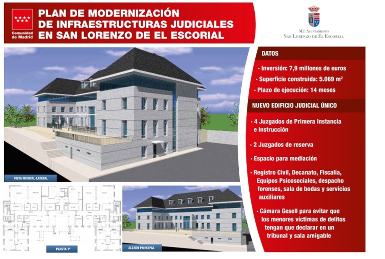 Recibimos información de la Secretaría de la Dirección General de RR. HH. y Relaciones con la Administración de Justicia, de la Consejería de Justicia, Interior y Víctimas de la Comunidad de Madrid, relativa a la próxima puesta en funcionamiento de la nueva sede de justicia en San Lorenzo de El Escorial. El nuevo edificio, distribuido en tres plantas y sótano con aparcamiento, permitirá superar el doble de la actual superficie judicial en el municipio.