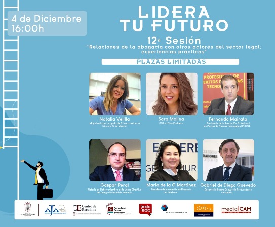 Presentamos la 12ª sesión online gratuita Lidera Tu Futuro que en esta ocasión estará dedicada a tratar el tema de las "Relaciones de la abogacía con otros actores del sector legal: experiencias prácticas", organizada por AJA Madrid en colaboración con el ICAM y Derecho Práctico, y que contará con la participación de nuestro decano, Gabriel M.ª de Diego, en representación de la procura madrileña.