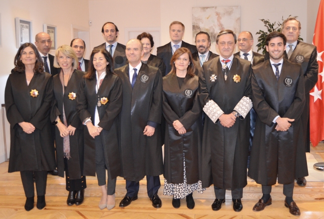 (En la imagen y en primera fila, de dcha. a izda. Vicente Ruigómez Ortiz de Mendívil, el decano Gabriel Mª de Diego, Alicia Rueda Sánchez-Barbudo, Santiago Rojo Dader, y las vocales Teresa de Donesteve, Pilar Azorín-Albiñana y María Granizo. En segunda fila, padrinos y demás miembros de la Junta de Gobierno).