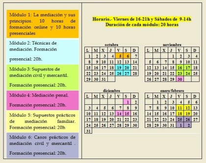 Por ello presentamos 6 módulos de mediación de 20 horas cada uno. Se han diseñado con la intención de cumplir los requisitos de formación que exige el RD 980/13 de 13 diciembre que desarrolló la Ley 5/2012 sobre Mediación Civil y Mercantil. Con la realización de alguno/s de estos módulos se puede completar la formación de aquellos que ya son mediadores y con la realización de todos ellos se obtiene la formación necesaria para conseguir el número de horas que da acceso al Registro de Mediadores del Ministerio de Justicia.