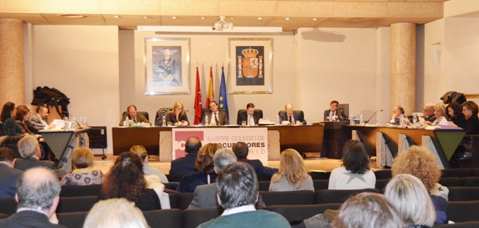 Continuando con su informe Gabriel Mª de Diego destacó las visitas de autoridades a la sede del Colegio, la más reciente este mismo martes, de la secretaría de Estado de Justicia Carmen Sánchez-Cortés, acompañada además por el secretario general de la Administración de Justicia Antonio Dorado; la nueva edición de la campaña de recogida de alimentos en colaboración con Cáritas Madrid, agradeciendo a todos la generosidad demostrada una vez más con la recogida de unos 3.500 kg. de productos y 2.599,23 euros de aportaciones económicas, superando así las cifras del año pasado y, por otro lado, la participación del Colegio en la Mesa de Trabajo organizada por la Consejería de la Comunidad de Madrid apoyando la unificación de sedes judiciales con la visita realizada a la nueva sede de la Audiencia Provincial en la calle Santiago de Compostela nº 100, así como el anuncio de la próxima creación de un nuevo núcleo penal en la zona de San Blas. En cuanto a las nuevas funciones y servicios de carácter público de la Procura, el decano animó a utilizar el Servicio de Actos de Comunicación organizado por el Colegio, resaltando el incremento en el número de asuntos que tramita.