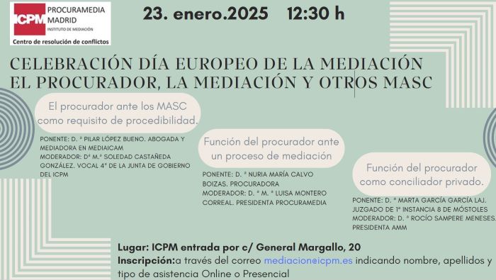 Con motivo del Día Europeo de la Mediación, vamos a celebrar una jornada en el salón de actos de nuestra sede (entrada por c/ General Margallo 20) con el título «El procurador, la mediación y otros MASC» el jueves DÍA 23 DE ENERO, a las 12:30 h.
