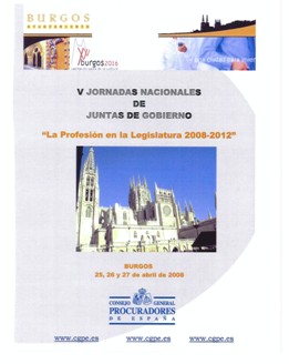 El Consejo General de Procuradores ha organizado en Burgos para los próximos días 25, 26 y 27 de abril, las V Jornadas Nacionales de Juntas de Gobierno de Colegios de Procuradores, que este año tratarán como tema general "La Profesión en la Legislatura 2008-2012".